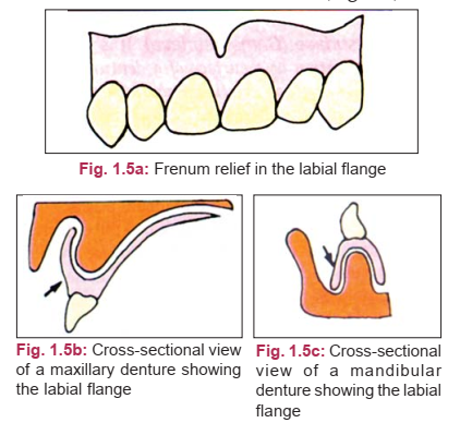 - Buccal Flange: Occupies the buccal vestibule, provides cheek support, and transmits force to the buccal shelf in the mandible. Requires relief for the buccal frenum.